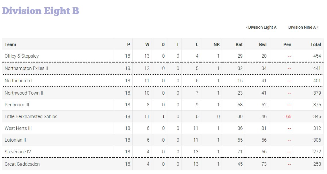 | SL | 1 Sept | West Herts III | A | 12:30 | Won by 135 runs | BL | 2 Sept | Steppingley | A | 13:30 | Won by 17 runs | ||||